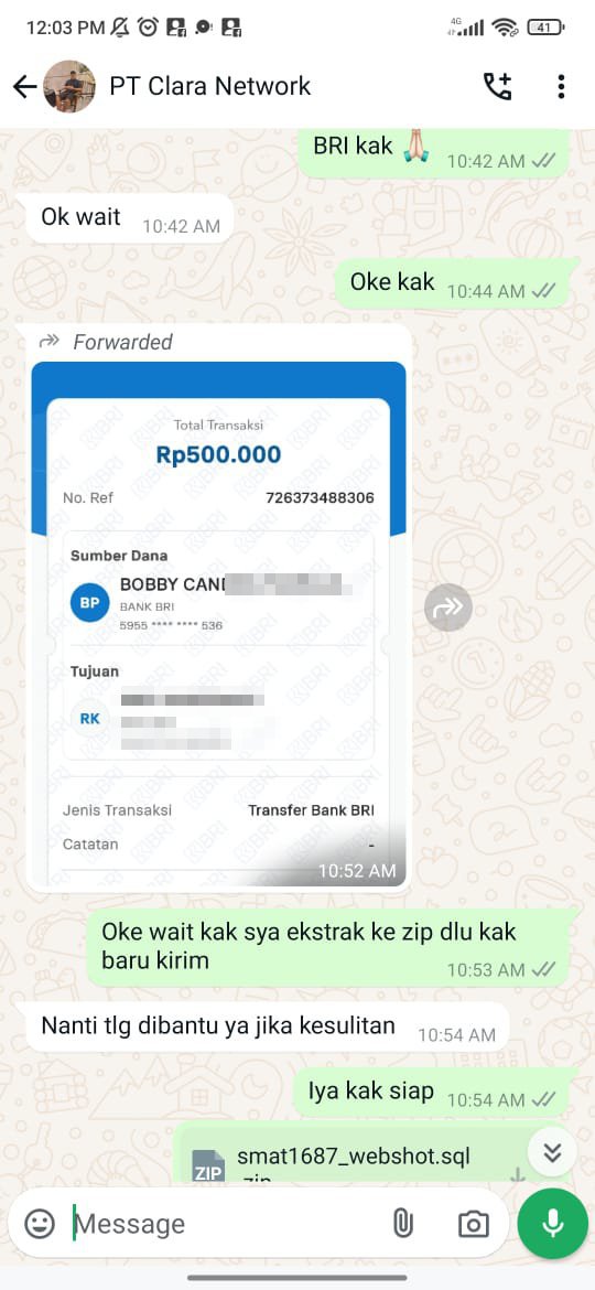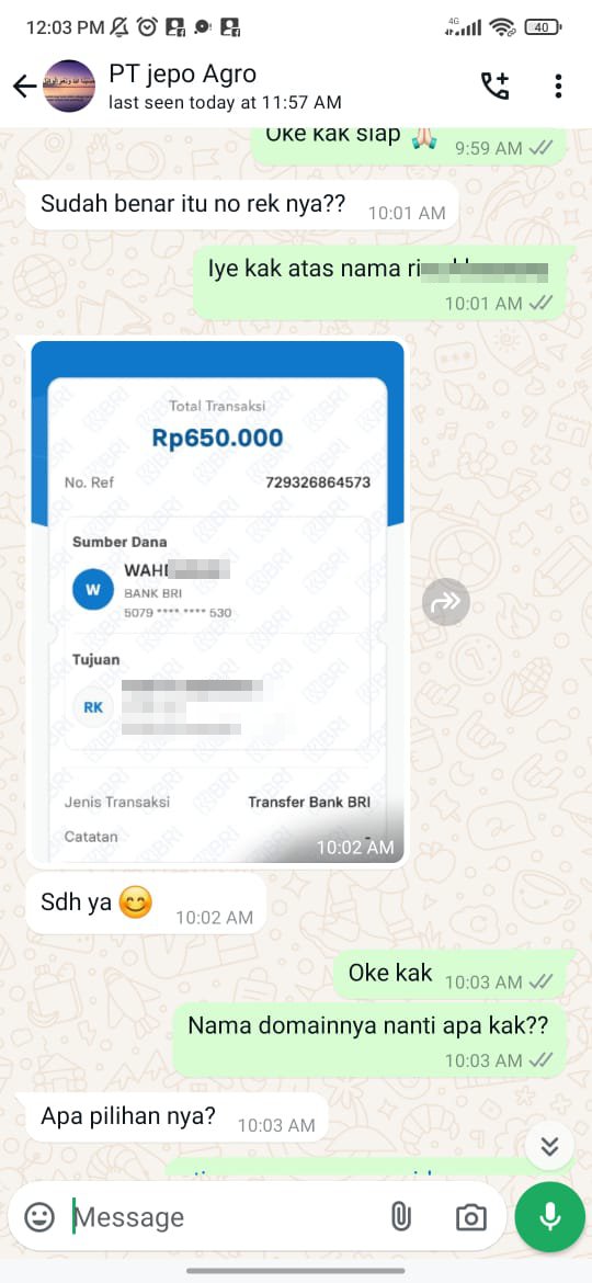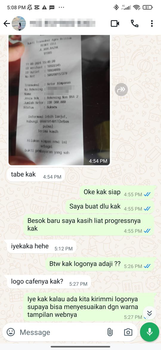 Setelah skema disepakati, lakukan pembayaran uang muka sebesar 50% dari total biaya. Proses pengerjaan website akan segera dimulai setelah pembayaran diterima.